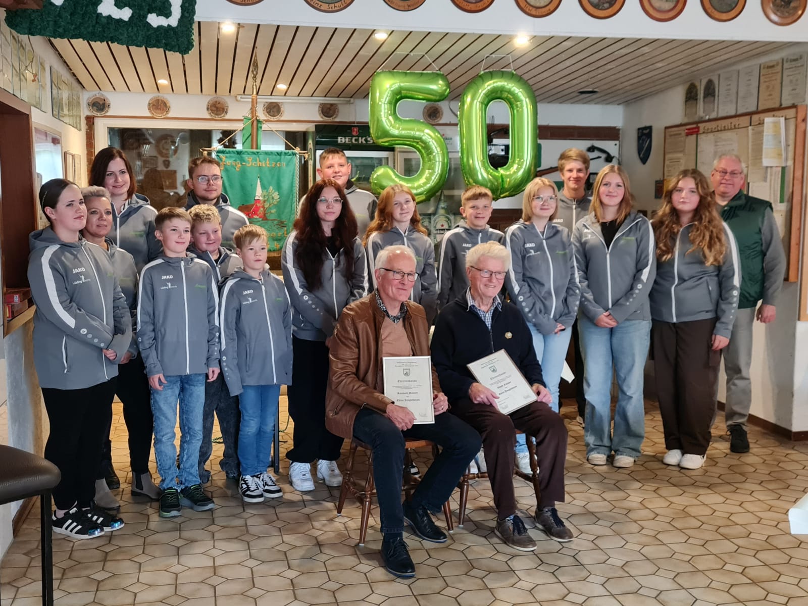 Lüdungworth. Kürzlich fand in der Lüdingworther Schützenhalle eine kleine Feier anlässlich des 50-jährigen Jubiläums der Jungschützen-Abteilung statt. Präsident Jens Struß konnte neben der gesamten Königsfamilie, die Ehrenmitglieder, die stellvertretende Kreisjugendleiterin Sabrina Kahrs, den Lüdingworther Ortsbürgermeister sowie Präsident des Bezirksschützenverbandes Elbe Weser Mündung Thomas Brunken sowie zahlreiche Gäste begrüßen. Nach der Begrüßung sowie einigen Grußworten übergab Jens Struß das Wort an Jugendsportleiter Torsten Schmidt. Dieser zeigte sich sehr erfreut, dass er mit Ehrenpräsident Ewald Foltmer den Mitbegründer der Jungschützen Abteilung begrüßen konnte. Im Jahre 1974 wurde auf Initiative von Harry Mühlenhoff und des damaligen Präsidenten Ewald Foltmer die Jungschützen Abteilung ins Leben gerufen. Schnell wurde die Jungschützen Abteilung eine feste Größe im Verein. Viele schießsportliche Erfolge wurden in den folgenden Jahren erreicht.