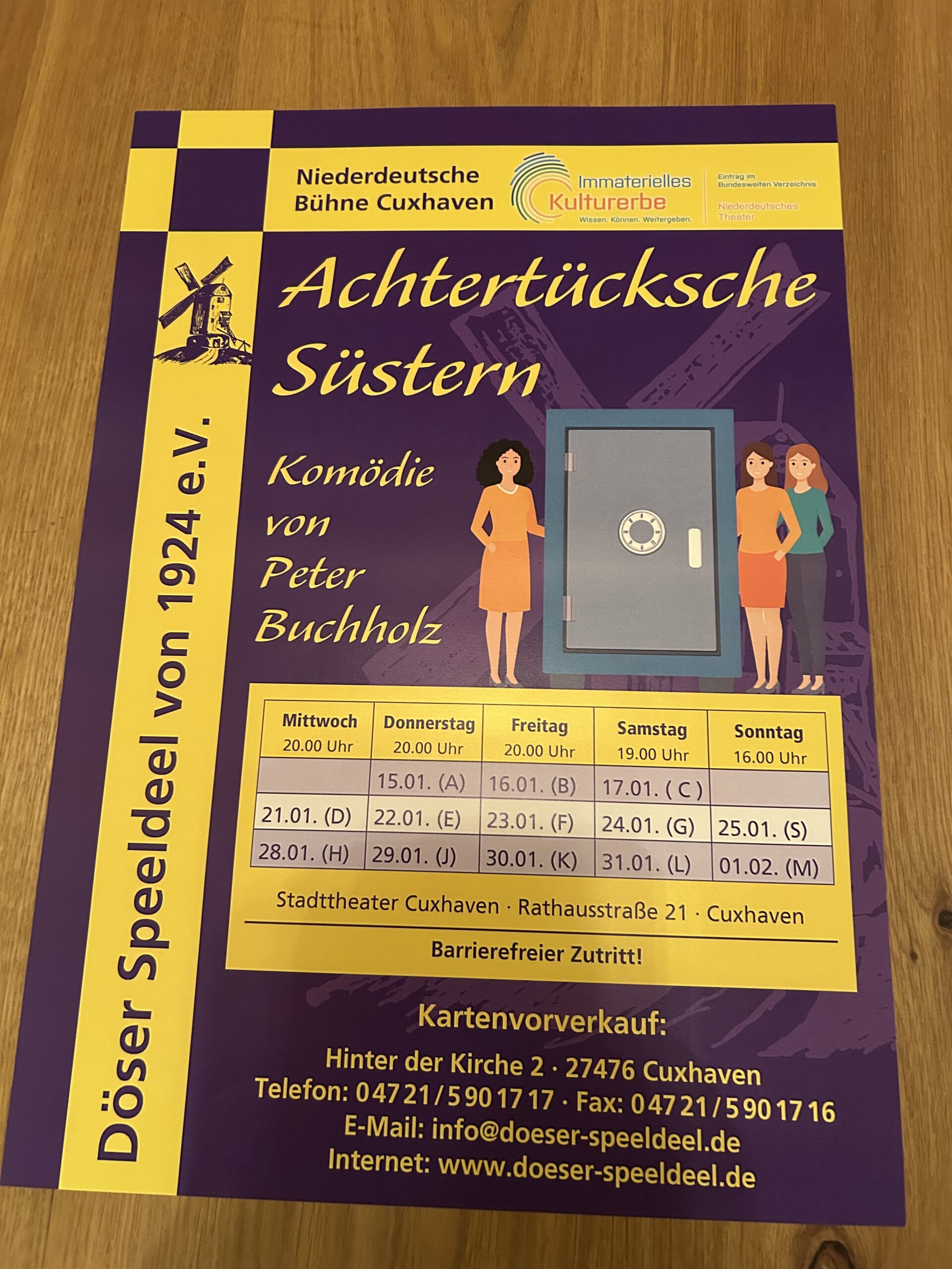 Cuxhaven. Die Döser Speeldeel zeigt ihre neue Kömödie „Achtertücksche Süstern“. Das Theaterstück ist noch bis zum 01.02.2026 im Stadttheater Cuxhaven (Rathausstraße. 21) zu erleben! Ihre Karten können Sie in unserer Geschäftsstelle ( Dienstag und Freitag von 15.30 -17.30 Uhr, Telefon 04721-5901717), an der Abendkasse sowie online auf unserer Website www.doeser-Speeldeel. de erwerben.  Wir freuen uns auf Sie!