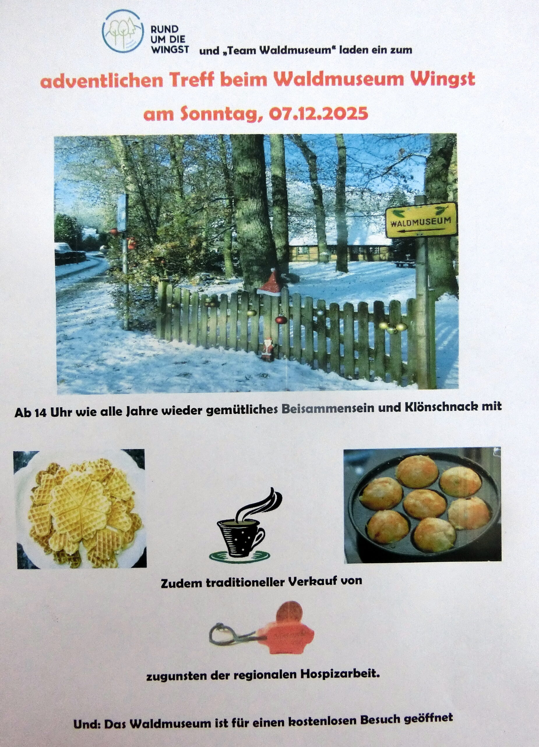 Wingst. Der Förderverein Waldmuseum Wingst und der Verein „Rund um die Wingst e. V.“ laden am 7. Dezember ab 14 Uhr wieder zu einem adventlichen Treff rund um das Waldmuseum an der Molkereistraße ein.  Besucher kombinieren so einen entspannten sonntäglichen Familienbesuch des Waldmuseums mit dem Genuss von Punsch oder Kaffee sowie der traditionellen „Brat’n Klüten“ und Waffeln unter freiem Himmel. Zudem können wie im Vorjahr die beliebten hölzernen Glücksschweinchen mit eingearbeitetem Glückscent als „Glücksboten 2026“ für sich selbst oder als willkommenes Geschenk für liebe Menschen gegen eine Spende erworben werden.  Die Einnahmen des Adventstreffs werden wie gewohnt für soziale Zwecke verwendet. Die ehrenamtlichen Gestalter des Adventstreffs freuen sich auf regen Zuspruch.