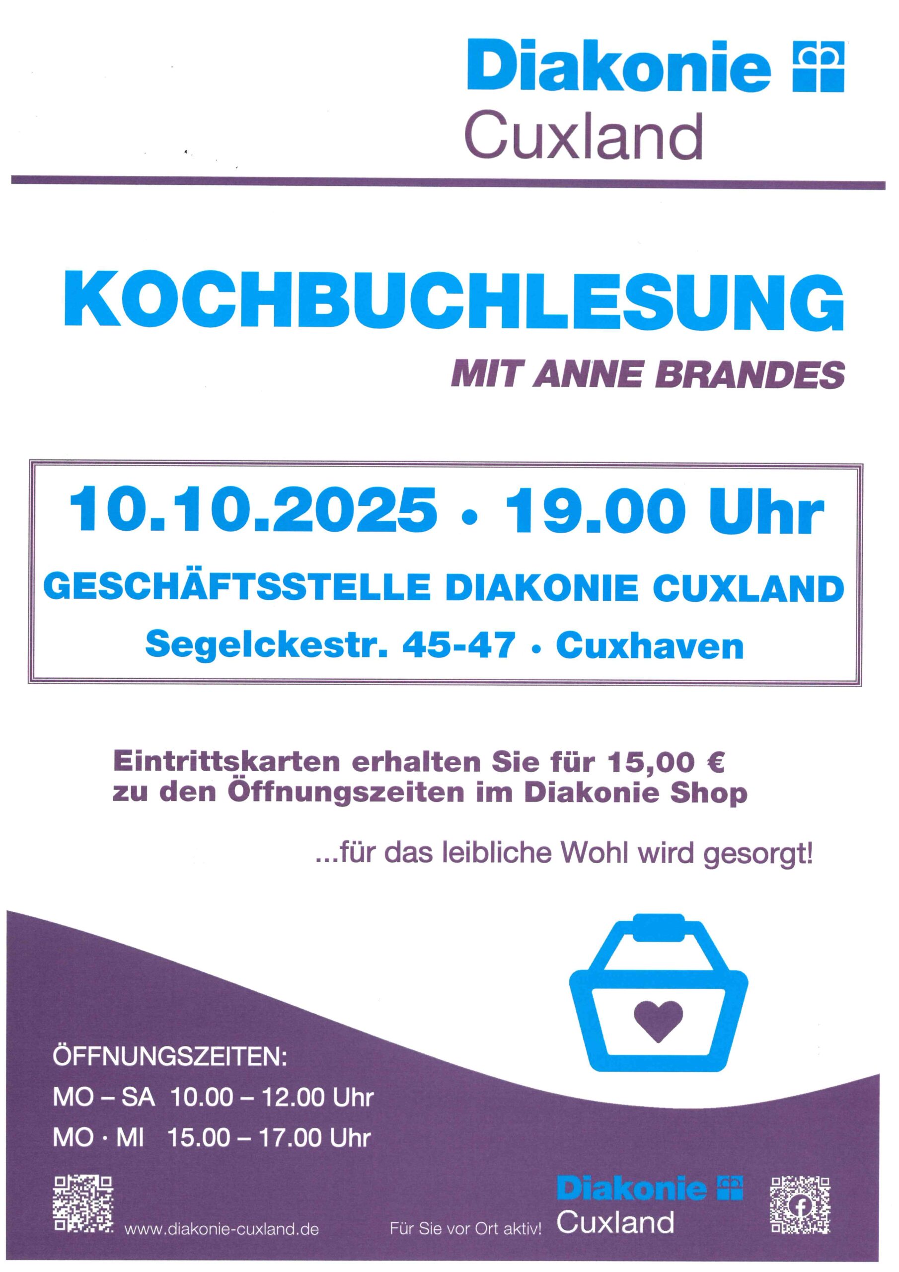 Cuxhaven. Unter dem Titel „Kochbuchlesung mit der Autorin Anne Brandes“ veranstaltet der Diakonie Shop am Samstag, 10. Oktober 2025, um …