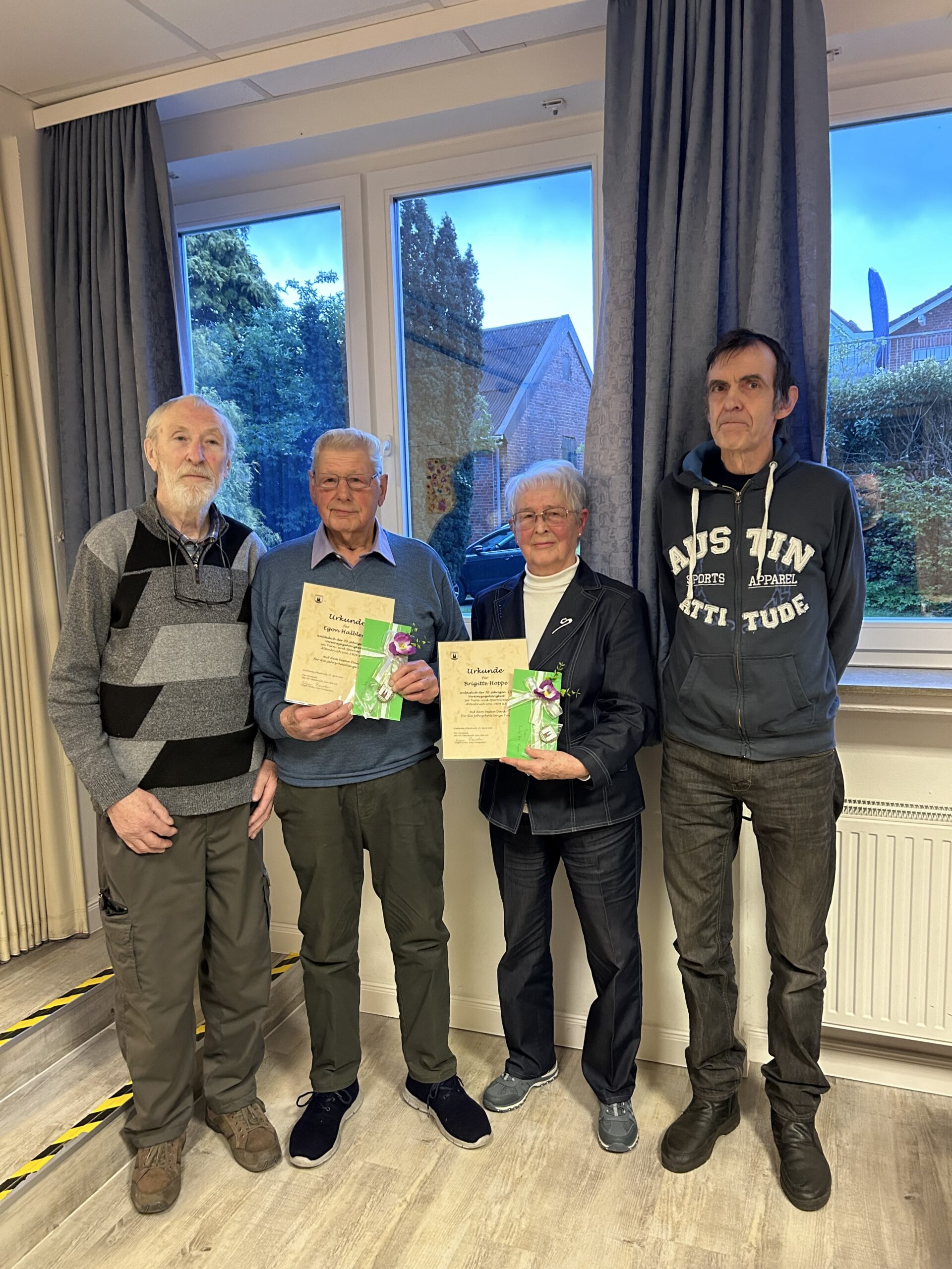 70 Jahre Vereinsmitgliedschaft v.l. Edgar Zander (1. Vorsitzender), Egon Halbleib, Brigitte Hoppe, Thomas Wesche (2. Vorsitzender) Foto: S. Flaig, TSV Altenbruch