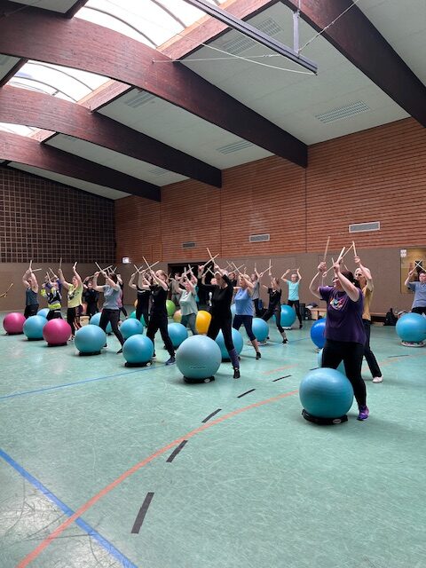 Danach wurden die Drumsticks nicht beiseitegelegt, sondern gleich für Aroha genutzt und im 3/4-Takt-Schrittfolgen der Maori-Tänze mit Kampfsportbewegungen kombiniert.