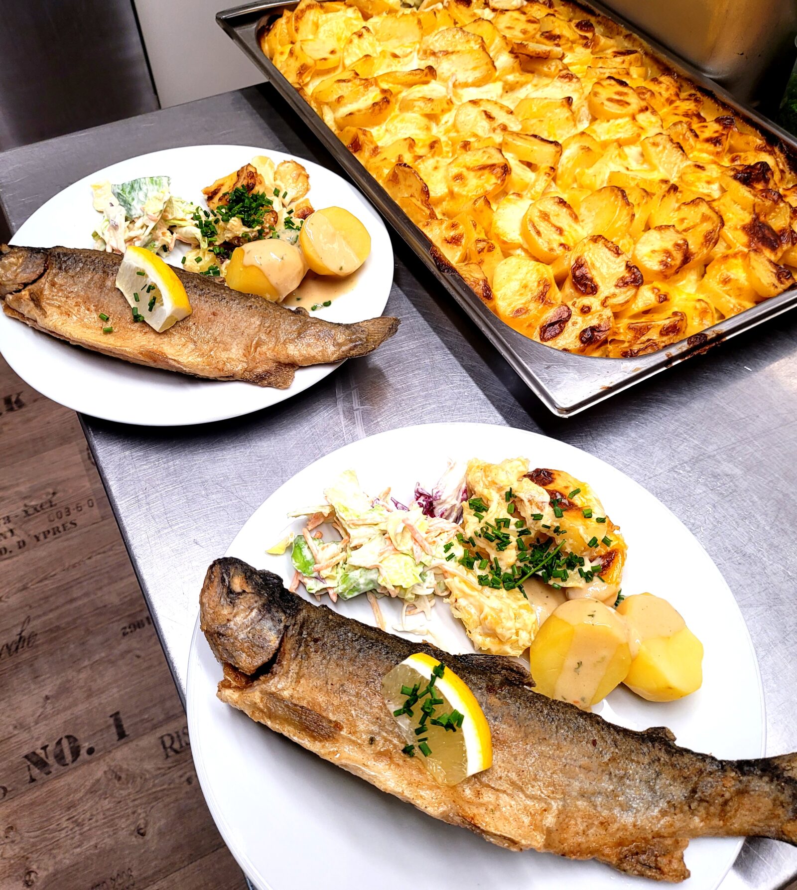 Cuxhaven. Dienstag, 17.2., war Promi-Kochtag in der Bürgerküche. Was wir erfolgreich im vergangenen Jahr gestartet haben, wünschen wir weiter fortzusetzen. Stefan Koch, „Zum Alten Torhaus“, Cuxhaven, half uns, eine großzügige Spende umzusetzen, und servierte unseren Mittagsgästen heute „Forelle – gebacken mit gemischtem Salat, Kartoffelgratin, Salzkartoffeln und einer Soße Admiral“. Zum Dessert gab es eine Zitronencreme unserer Küchenchefin. So kann aus einem normalen Dienstag ein Festtag werden, und wir bedanken uns, auch im Namen unserer überraschten und begeisterten Gäste, bei dem Spender der Forellen und bei den Köchen Stefan Kopf und Stefan Dege für dieses leckere Essen.