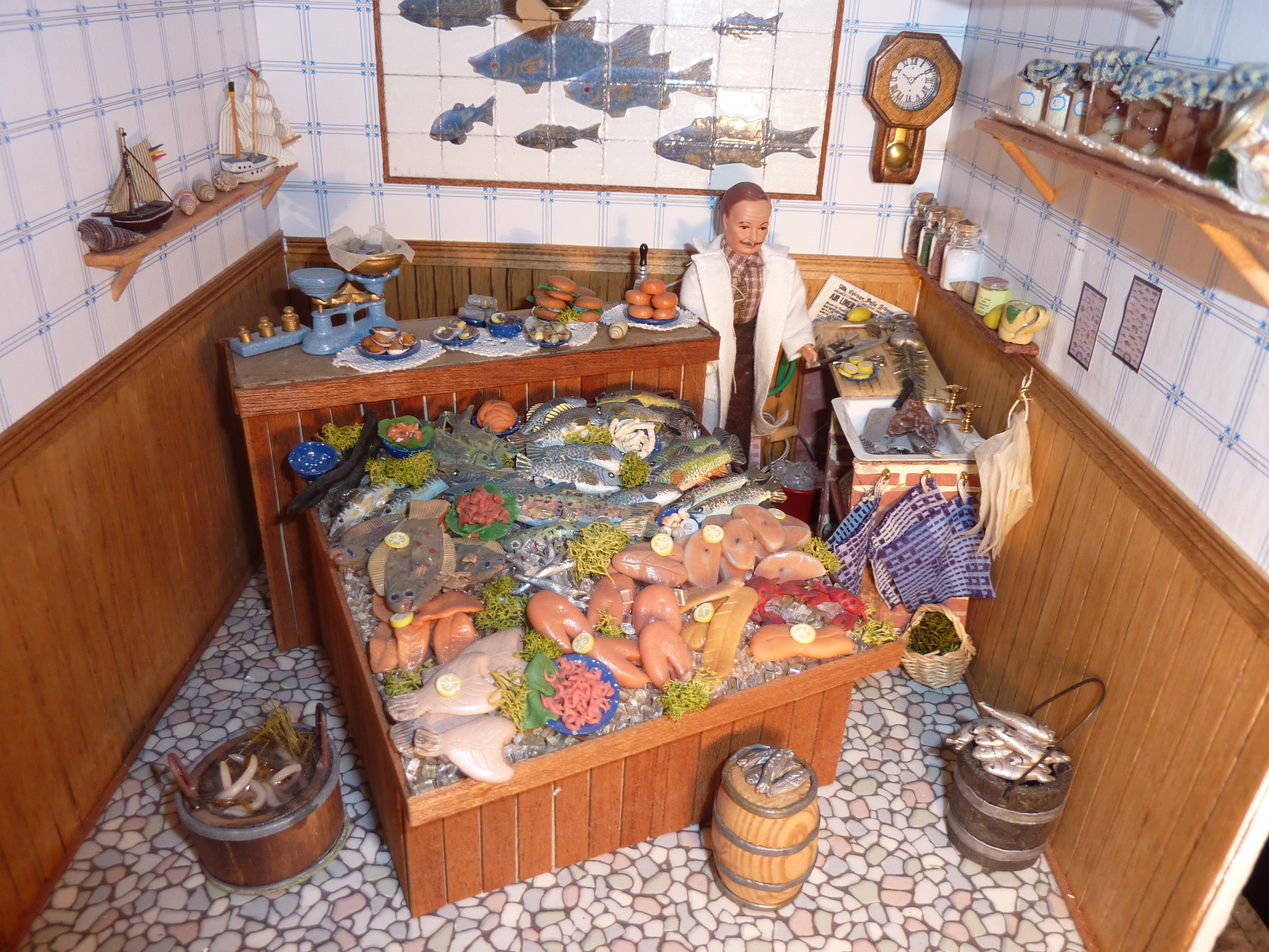 Was mich an dem Hobby fasziniert ist die große Bandbreite an Möglichkeiten. Sowohl in der Gestaltung als auch in der Materialauswahl. Ich bevorzuge einzelne kleine Räume die ich gerne nach meiner Vorstellung einrichte. Detailverliebtheit ist mir wichtig und meist gibt es in meiner Fantasie zu meinen Räumen eine Geschichte. Besonders Spaß macht mir zu sehen was man aus was machen kann, so ist zum Beispiel ein kleiner Kopfhörerknopf nun eine Schleifmaschine oder ein Fön. Perlen werden zu Flacons, Spatel zu Regalen und Knöpfe zu Obsttellern. Nicht alles mache ich selbst, auch gekauftes Zubehör findet Platz in meinen Szenerien. Auch Aufträge habe ich gerne gestaltet, so steht eine Arbeit im “Armen Ritter” und eine Stube im Baljer Leuchtturm von mir. Einen kleinen Freundeskreis gründete ich 2000 und mit den “Minipatches” bestritten wir einige eigene Ausstellungen in Hammah.