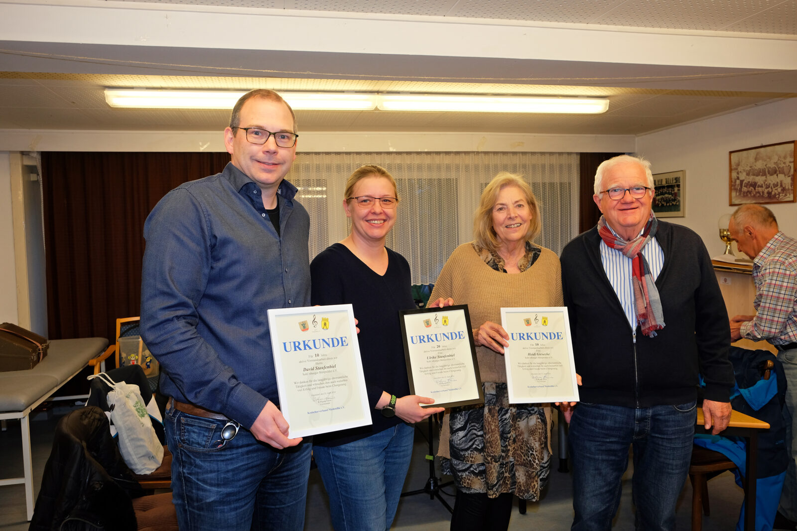 Der 1. Vorsitzende des Kreis-Chorverbandes Niederelbe Wolfgang Zinow überreichte Ulrike Staufenbiel für 20 Jahre aktive Vorstandsarbeit eine Urkunde und das Ehrenzeichen in Gold. Heidi Giesecke und David Staufenbiel erhielten für zehn Jahre aktive Vorstandsarbeit ebenfalls eine Urkunde und das Ehrenzeichen in Silber. Die drei Mitglieder freuten sich sehr über die Wertschätzung und den Strauß Blumen beziehungsweise die Flasche Wein.