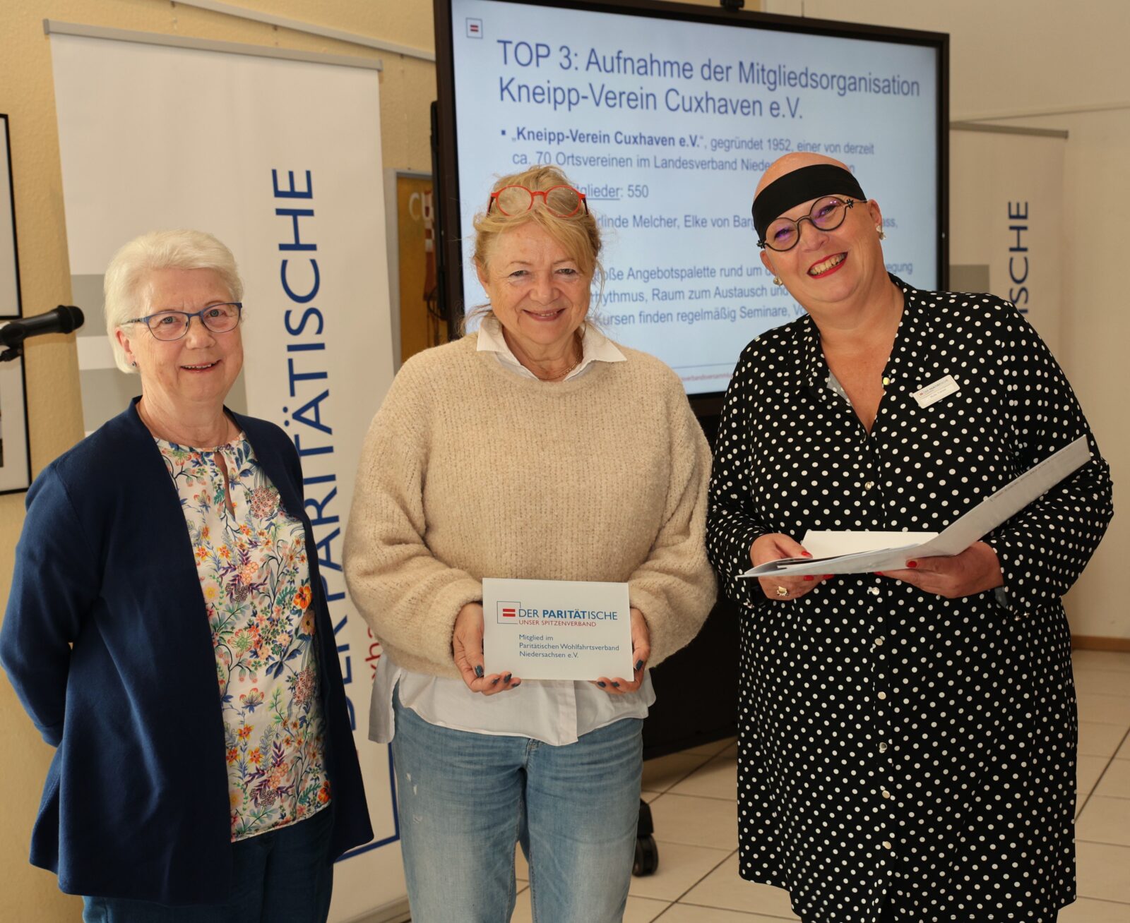 V.l.) Elke von Bargen und Gerlinde Melcher (Teamvorstand Kneipp-Verein Cuxhaven) und Pari-Geschäftsführerin Helle Vanini freuen sich über die Aufnahme des Kneipp-Vereins in den Pari-Kreisverband.