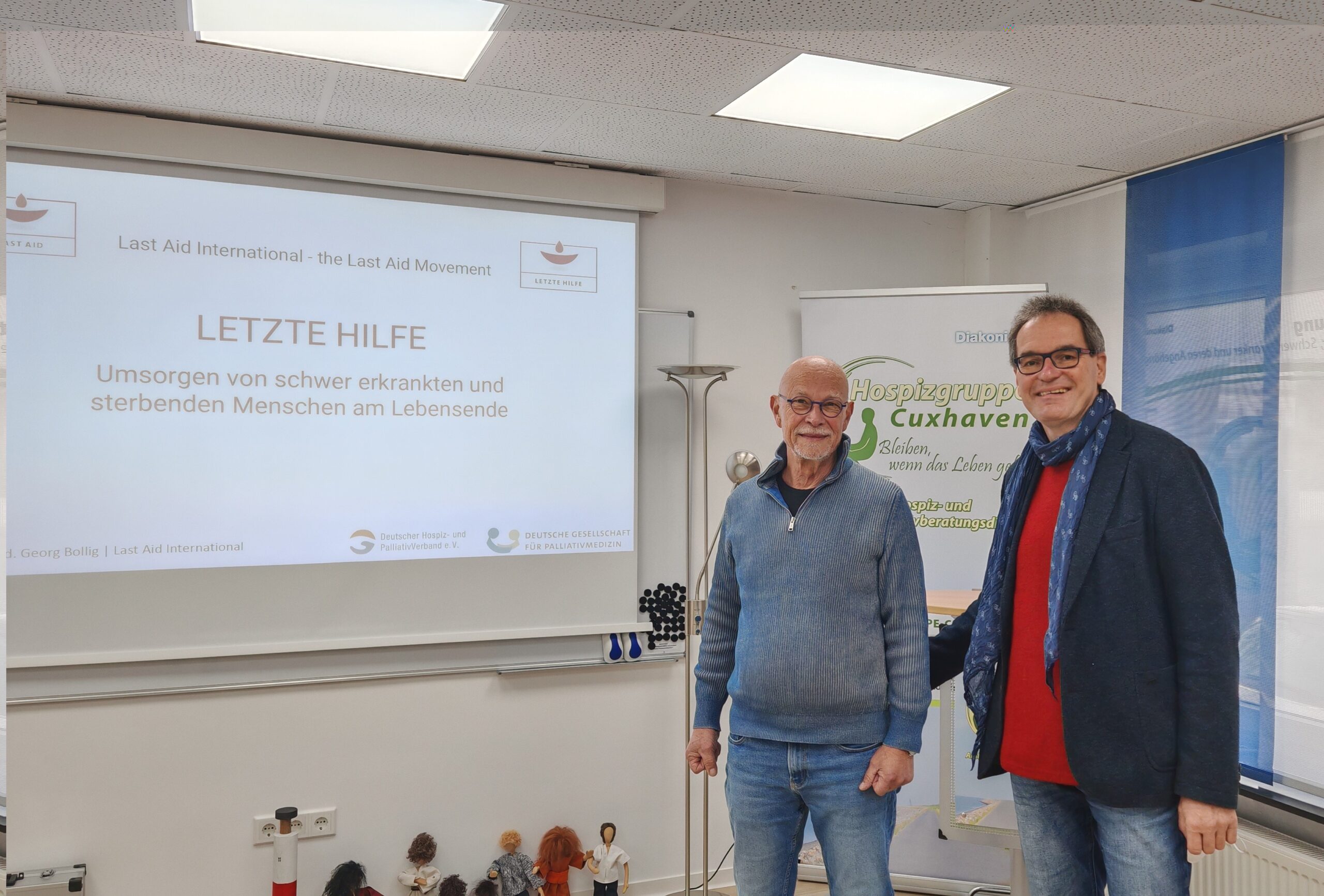 Cuxhaven. In Cuxhaven stoßen die „Letzte-Hilfe-Kurse“, die die Hospizgruppe Cuxhaven regelmäßig als ambulanter Hospiz- und Palliativberatungsdienst für Erwachsene der Diakonie Cuxland anbietet, auf großes Interesse. Zahlreiche Kursinteressierte nahmen das Angebot an und folgten den Ausführungen von Hospizmitarbeiter Christian Behm und Fachbereichsleiter und Koordinator Diakon Jörg Peters. Letzte Hilfe Kurse sind das Pendant zu den „Erste-Hilfe-Kursen“. Am Ende wissen Sie, wie es geht: das kleine 1 × 1 der Sterbebegleitung. Das Lebensende und Sterben unserer Angehörigen, Freunde und Nachbarn macht uns oft hilflos, denn uraltes Wissen zum Sterbegeleit ist mit der Industrialisierung schleichend verloren gegangen. Um dieses Wissen zurückzugewinnen, bietet die Hospizgruppe Cuxhaven als themennahe Einrichtung Kurse zur „Letzten Hilfe“ an. In diesen Kursen lernen interessierte Bürgerinnen und Bürger, was sie für die ihnen Nahestehenden am Ende des Lebens tun können. Es wird Basiswissen und Orientierungen und einfache Handgriffe vermittelt. Sterbebegleitung ist keine Wissenschaft, sondern ist auch in der Familie und der Nachbarschaft möglich, natürlich auch durch die ambulante Hospizarbeit der Hospizgruppe Cuxhaven durch ausgebildete Ehrenamtliche, die kostenfrei Lebensbegleitung in der letzten Lebensphase für Betroffene und Angehörige anbietet. Die Hospizgruppe Cuxhaven wird auch im neuen Jahr neue Letzte-Hilfe-Kurse anbieten, sodass Interessierte die Möglichkeit zur Anmeldung haben, sofern sie an den letzten Kursen nicht teilnehmen konnten. Nähere Informationen auch auf der Homepage des ambulanten Hospizdienstes unter www.hospizgruppe-cuxhaven.de sowie zu gegebener Zeit mit den nächsten Terminangeboten oder bei Diakon Jörg Peters unter 04721/5109255.