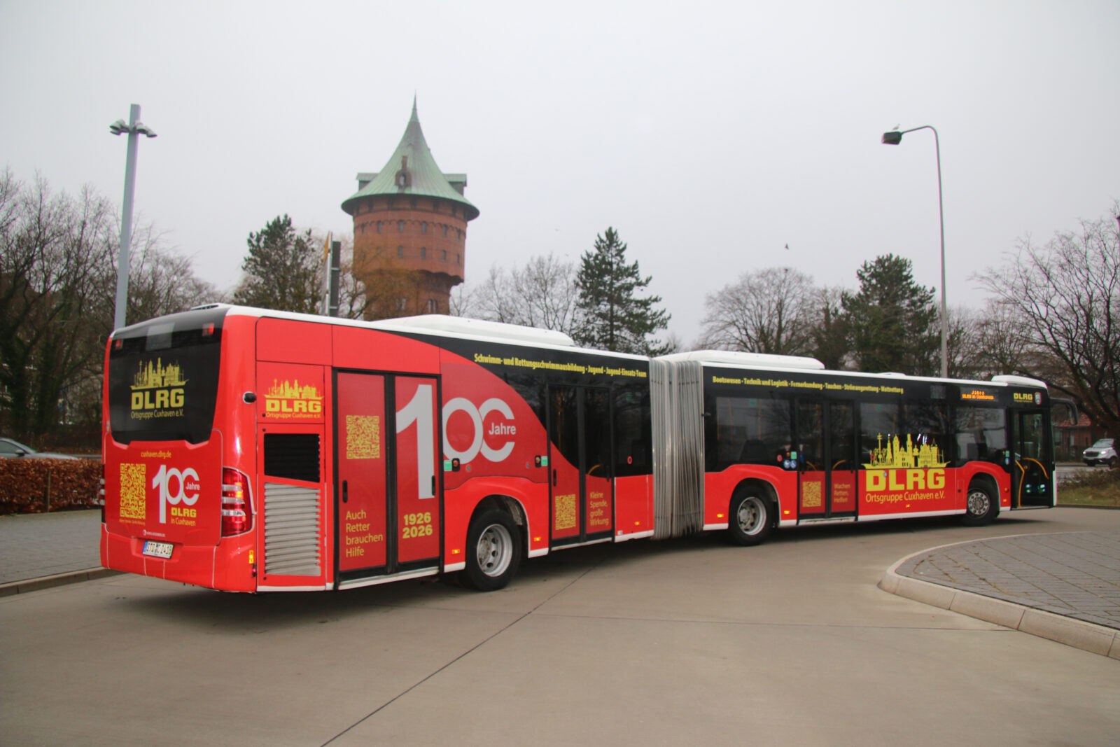 Cuxhaven. Ein wahrer Blickfang rollt nun durch Cuxhaven: Ein Gelenkbus der KVG in knallroten und sonnengelben Farben, die die DLRG repräsentieren. Diese auffällige Gestaltung ist mehr als nur ein Hingucker – sie markiert den offiziellen Beginn der Feierlichkeiten zum 100-jährigen Jubiläum der DLRG Cuxhaven im Jahr 2026.