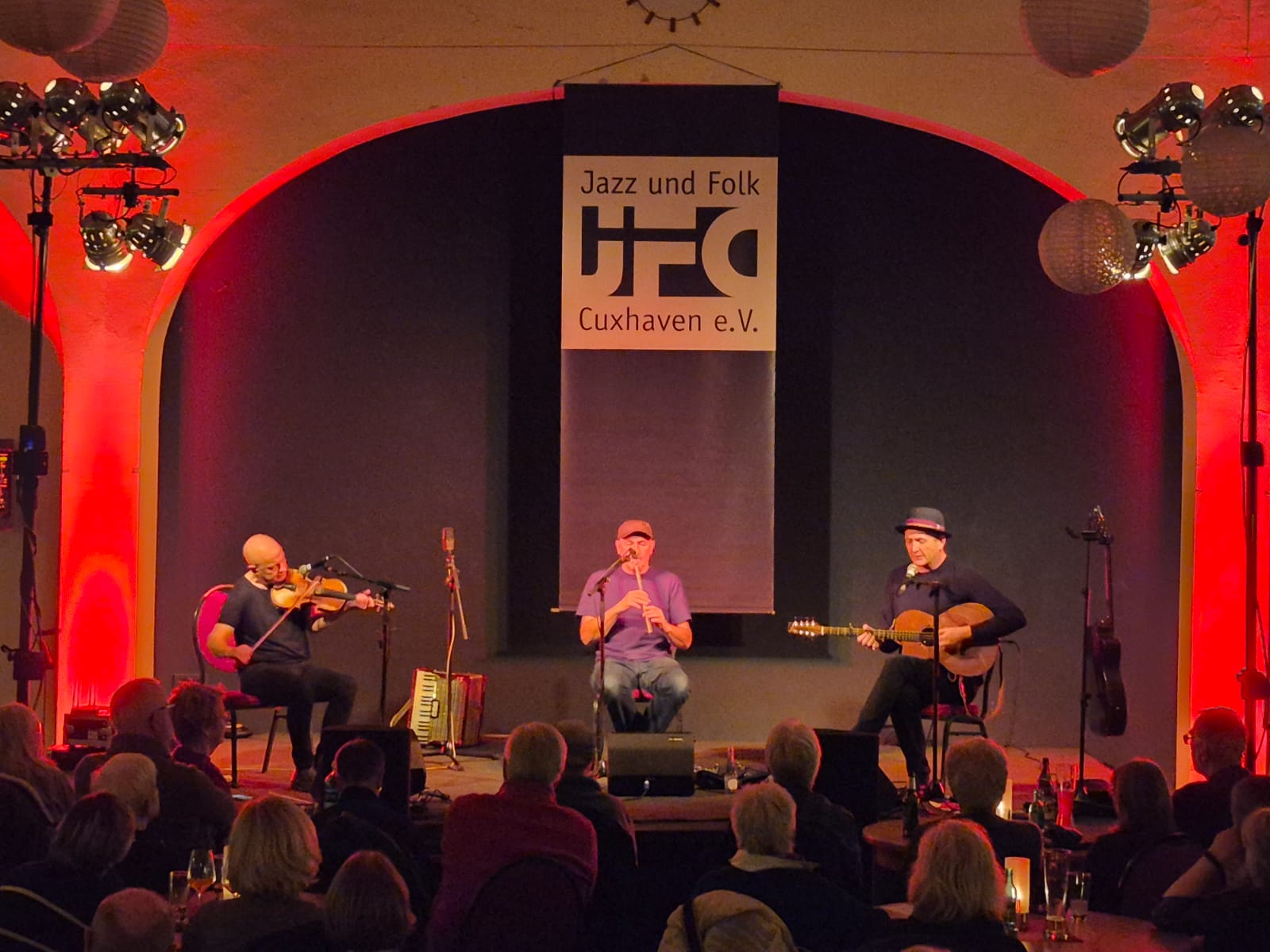 Cuxhaven. Zum letzten Konzert dieses Jahres hatte der Verein „Jazz und Folk Cuxhaven eV“ (JFC) erneut ein absolutes Highlight im Programm, das den Fans keltischen Folks teilweise stundenlange Anreisen wert war. Entsprechend gut war die Stimmung in der fast ausverkauften Hapag-Halle von Anfang an und endete mit Standing ovations des Publikums. Ein Abend voller Charme, Energie und musikalischer Präzision: Das Konzert von Michael McGoldrick, John McCusker und John Doyle entführte das Publikum in die lebendige Welt des Celtic Folk. Von den ersten Takten an war klar, dass hier nicht nur drei Virtuosen, sondern auch langjährige Weggefährten auf der Bühne standen, deren Zusammenspiel von blindem Vertrauen und feinem Humor getragen wurde.
