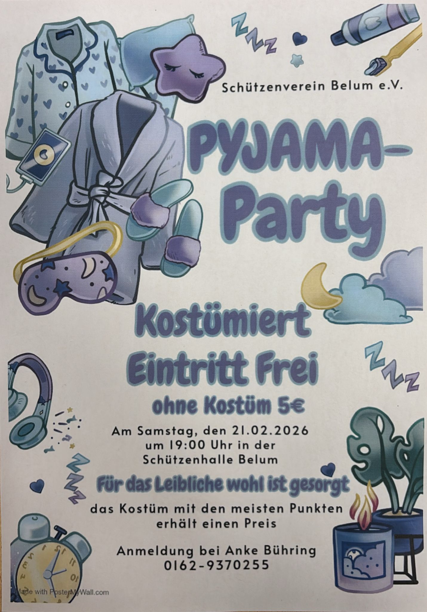 Belum. Der Schützenverein Belum e.V. möchte in diesem Jahr einmal etwas Neues ausprobieren und lädt dazu alle Interessierten recht herzlich ein, am Samstag, dem 21. Februar 2026, ab 19:00 Uhr in der Schützenhalle eine „Pyjamaparty“ zu feiern. Für Kostümierte ist der Eintritt frei, ansonsten müssen 5,– € gezahlt werden. Snacks und Getränke werden angeboten, sodass gestärkt fröhlich gefeiert werden kann. Bitte bei Anke Bühring anmelden unter der Telefonnummer 0162-9370255. Der Verein würde sich über eine rege Beteiligung sehr freuen.