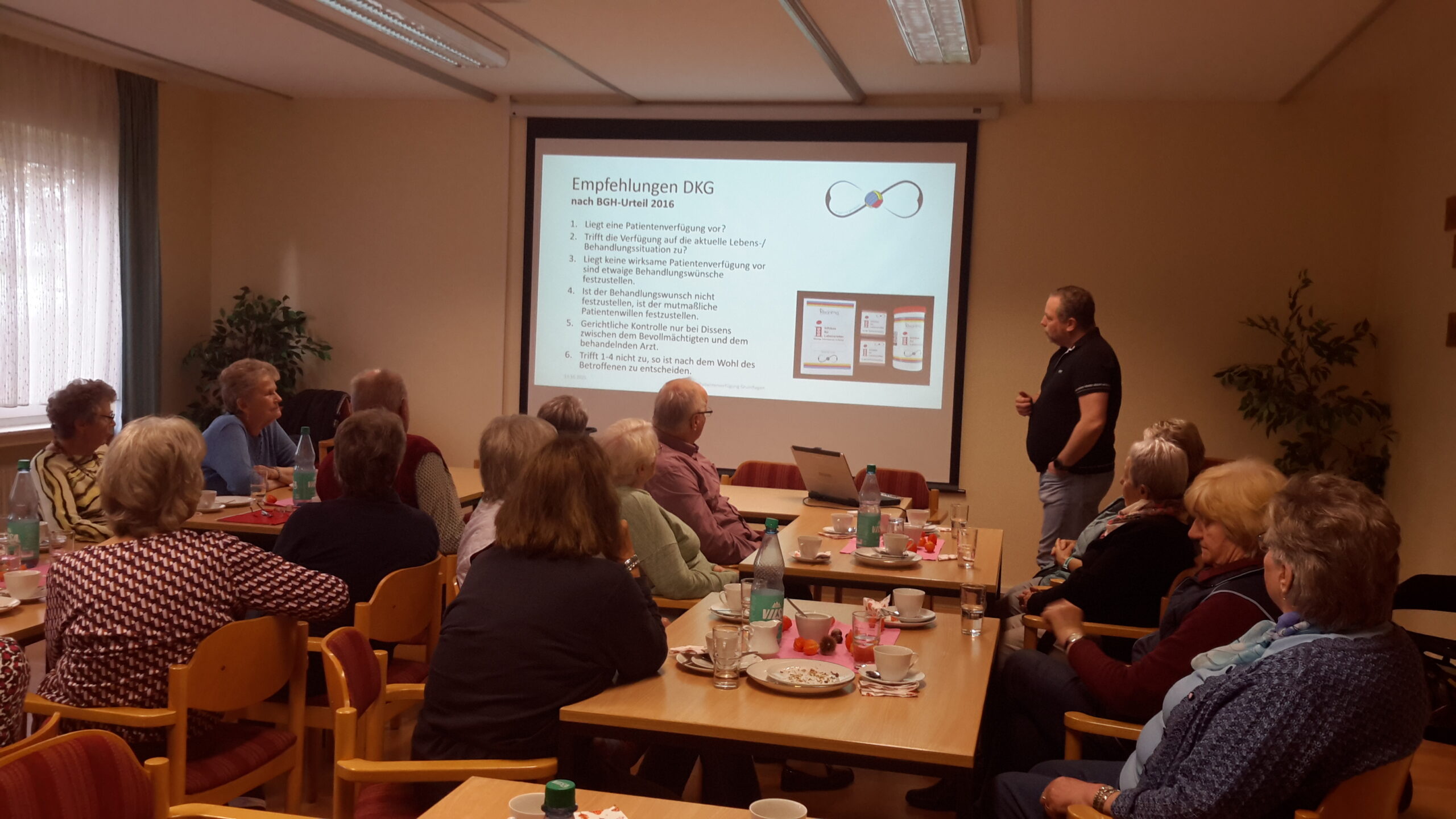 Hechthausen. Am 13. Oktober hatten wir beim Seniorennachmittag den Facharzt für Allgemein-, Notfall- und Palliativmedizin Herrn Manuel Burkert von der Gemeinschaftspraxis am Bürgerpark mit Frau Danka Gerger von der Stiftung Reanima zu Gast. Nach einem gemütlichen gemeinsamen Kaffeetrinken referierte Herr Burkert zum Thema Patientenverfügung. Das ist ein äußerst wichtiges Dokument sowohl für einen selbst als auch für die Angehörigen und das medizinische Personal. Wer sich rechtzeitig damit befasst, nimmt allen Betroffenen eine große Last und vermeidet ggf. Streitigkeiten im familiären Umfeld. Herr Burkert veranschaulichte mit Bildtext und privaten Erklärungen, worauf es bei Formulierungen nach der Gesetzesänderung 2009 ankommt. Mit beispielhaften Formulierungen wurden die feinen, wichtigen Unterschiede deutlich. Als Hinweis für eine Vorlage wurde das Bundesministerium für Justiz (Patientenverfügung) genannt. Das Dokument kann jederzeit ergänzt oder erneuert werden. Es wurde auch noch einmal an die Wichtigkeit der aktuellen Notfalldose im Kühlschrank erinnert. Es konnten zwischendurch immer persönliche Fragen gestellt werden. Im Anschluss sah sich Herr Burkert mitgebrachte Verfügungen an und gab ggf. Verbesserungsvorschläge. Am Ende waren sich alle einig: Das war eine interessante und wichtige Veranstaltung.