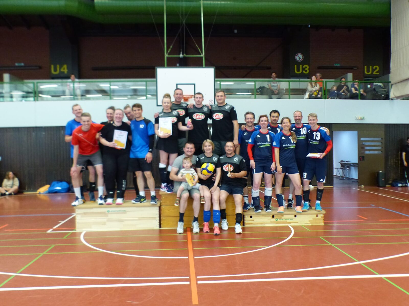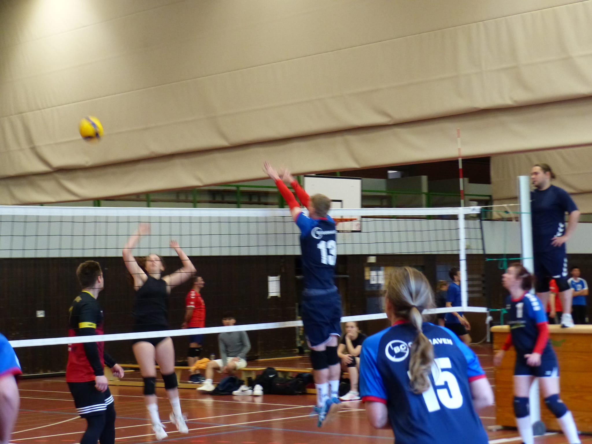 Nach der Mittagspause am leckeren Buffet ging es dann darum, trotz starker Gegner, weiter schönen Volleyball zu spielen und am Ende vielleicht sogar einen Platz auf dem Treppchen zu sichern. Dank wirklich starker Angriffe und Blöcke konnte man dann das erste Spiel in der Platzierungsrunde gewinnen. Die Freude darüber war umso größer, da es sich hierbei um den Gegner aus der Vorrunde handelte, gegen den man zuvor noch verloren hatte. Im zweiten Spiel hielt man mit den Spieler:innen aus Schaumburg anfangs noch gut mit, musste sich dann aber doch geschlagen geben. Nur im letzten Spiel gegen den späteren Turniersieger lief es nicht mehr rund, sodass es letztlich die einzige deutliche Niederlage des Turniers gab.