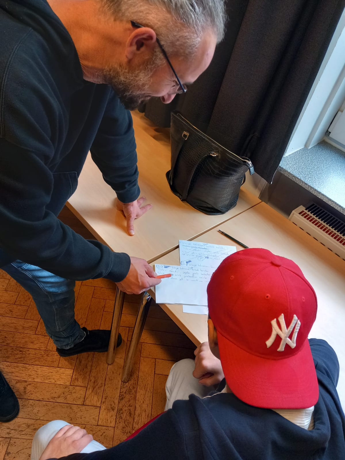 Bildunterschrift: Enderhan Duruk mit Klassenlehrer Serat Gürkan (l.) beim Schreiben eines RAP-Textes.