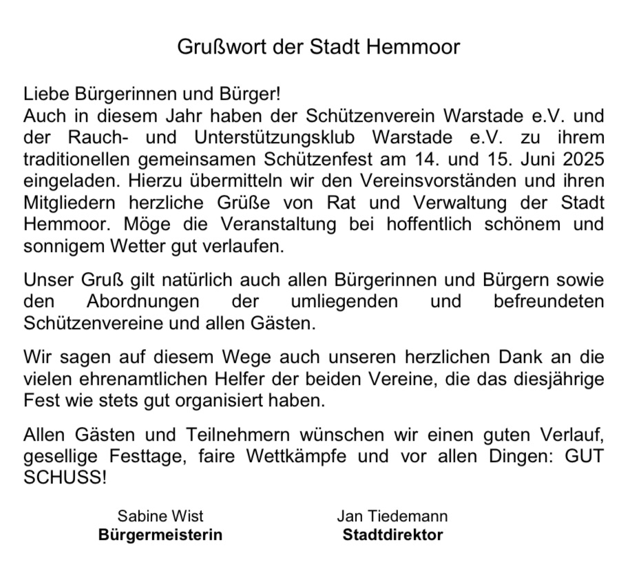 Das Fest wird durch die Vereinsvorsitzenden und einen Vertreter der Stadt Hemmoor am Samstag, 14. Juni, um 17:30 Uhr offiziell eröffnet!