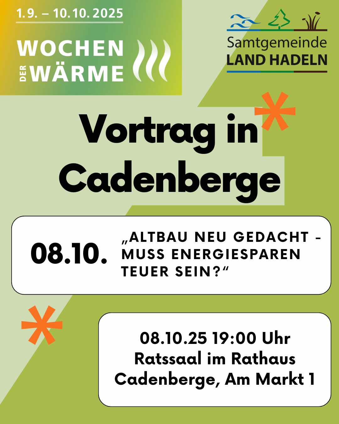Cadenberge. Am Mittwoch, dem 8. Oktober 2025, findet im Ratssaal im Rathaus Cadenberge ein Vortrag zum Thema Energieeffizienz und Modernisierung …