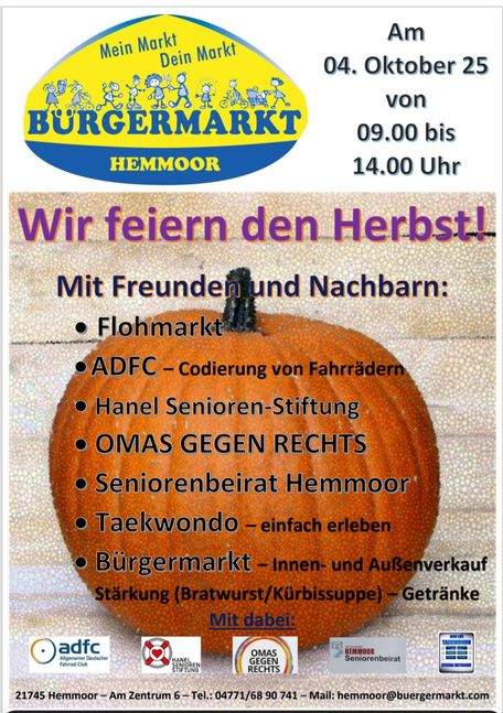Am 23. September ist es mal wieder soweit. Der Bürgermarkt Hemmoor feiert mit Freunden und Nachbarn den Herbst. Von 09 …