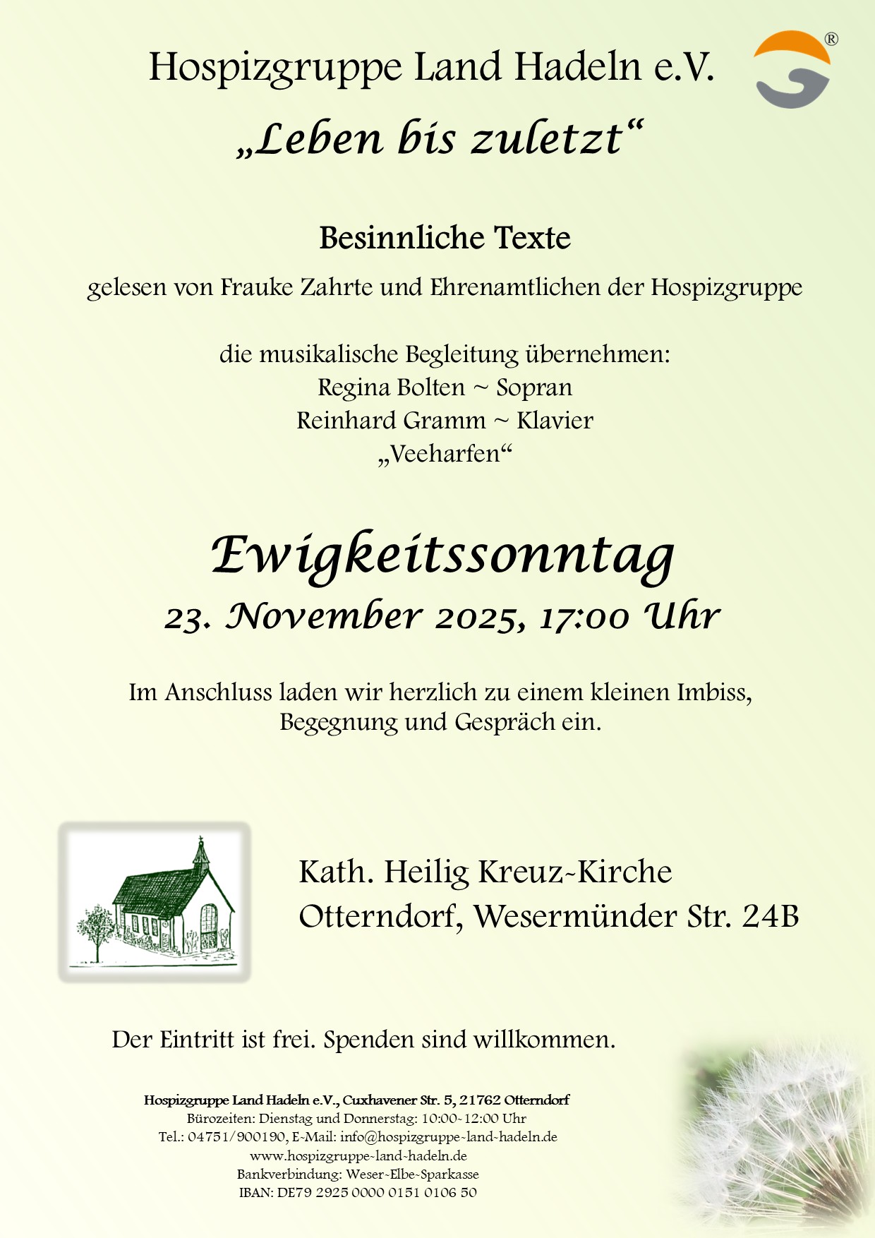 Otterndorf. Die Hospizgruppe Land Hadeln e. V. möchte zu ihrer alljährlichen Lesung mit besinnlichen Texten und Musik am Ewigkeitssonntag, dem …