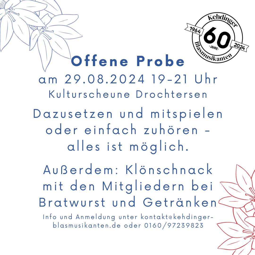Drochtersen. Die Kehdinger Blasmusikanten e.V. laden herzlich zur offenen Probe am 29. August 2024 in die Kulturscheune Drochtersen ein. Ab …