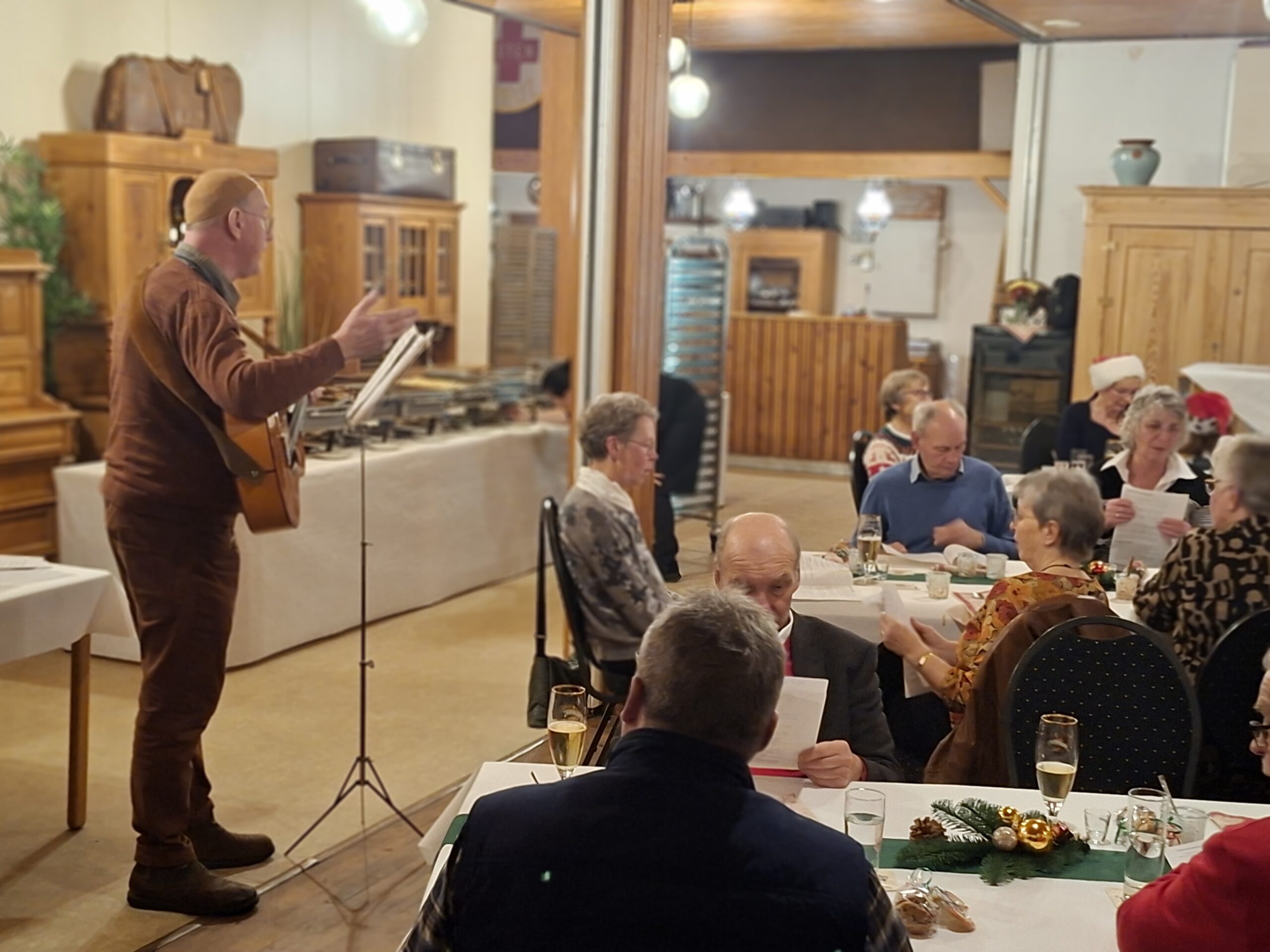 Auch das Essen kam nicht zu kurz. Dieses Mal begann das Buffet mit knusprigem Entenbraten, gefolgt von unterschiedlichen schmackhaften Beilagen – und von allem gab es wieder einmal sehr reichlich. Eine Nachspeise zum Schluss durfte natürlich nicht fehlen. Auf den weihnachtlich geschmückten Tischen waren Teller platziert, in denen von Mitgliedern gebackene Kekse genascht werden konnten. Es wurde gut zugelangt – bald waren die Teller leergefuttert. Wie gut, dass jeder Gast noch einen Beutel Kekse mit nach Hause nehmen durfte.