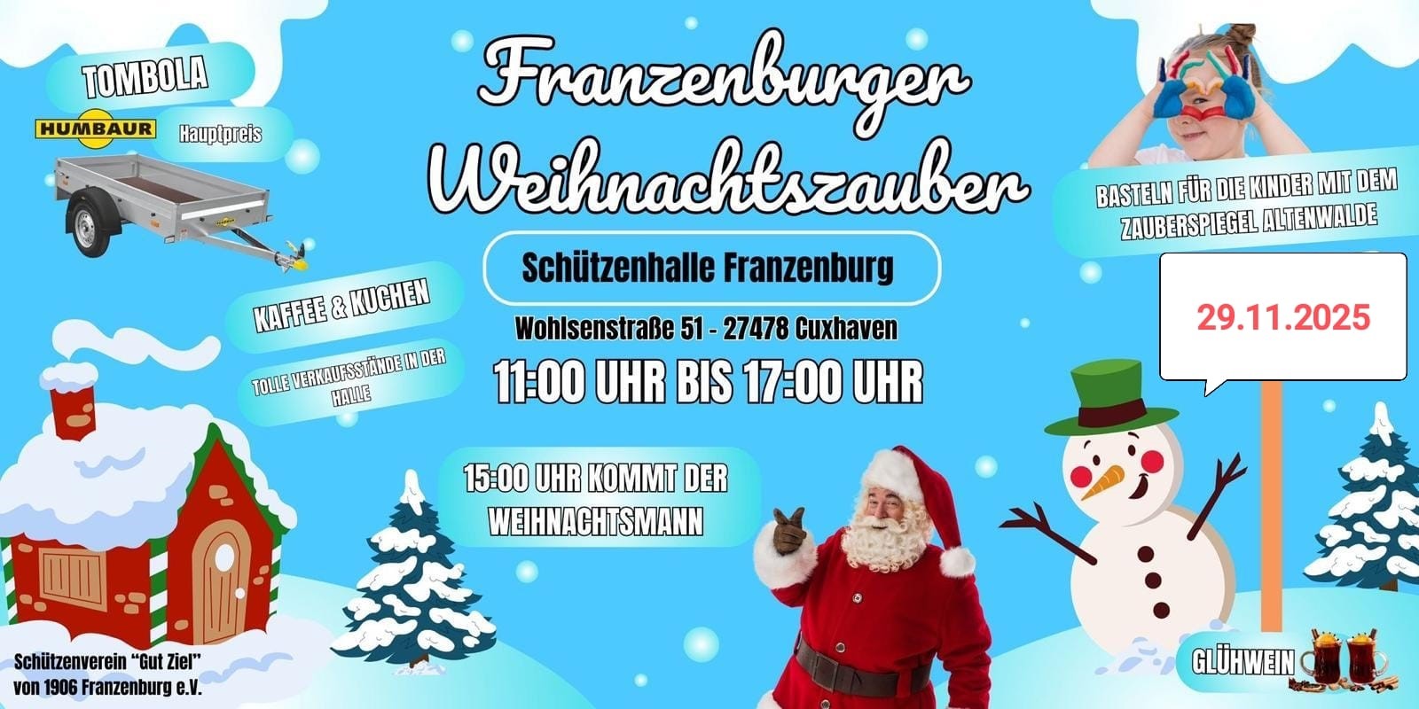 Cuxhaven-Altenwalde. Wenn sich der Duft von Glühwein, Waffeln und Bratwurst in der Luft mischt, dann ist es wieder so weit: Der traditionelle Winterzauber in der Franzenburger Schützenhalle öffnet seine Tore. Am Samstag, 29. November 2025, ab 11 Uhr erwartet die Besucherinnen und Besucher in der Wohlsenstraße 51 ein stimmungsvoller Start in die Adventszeit.