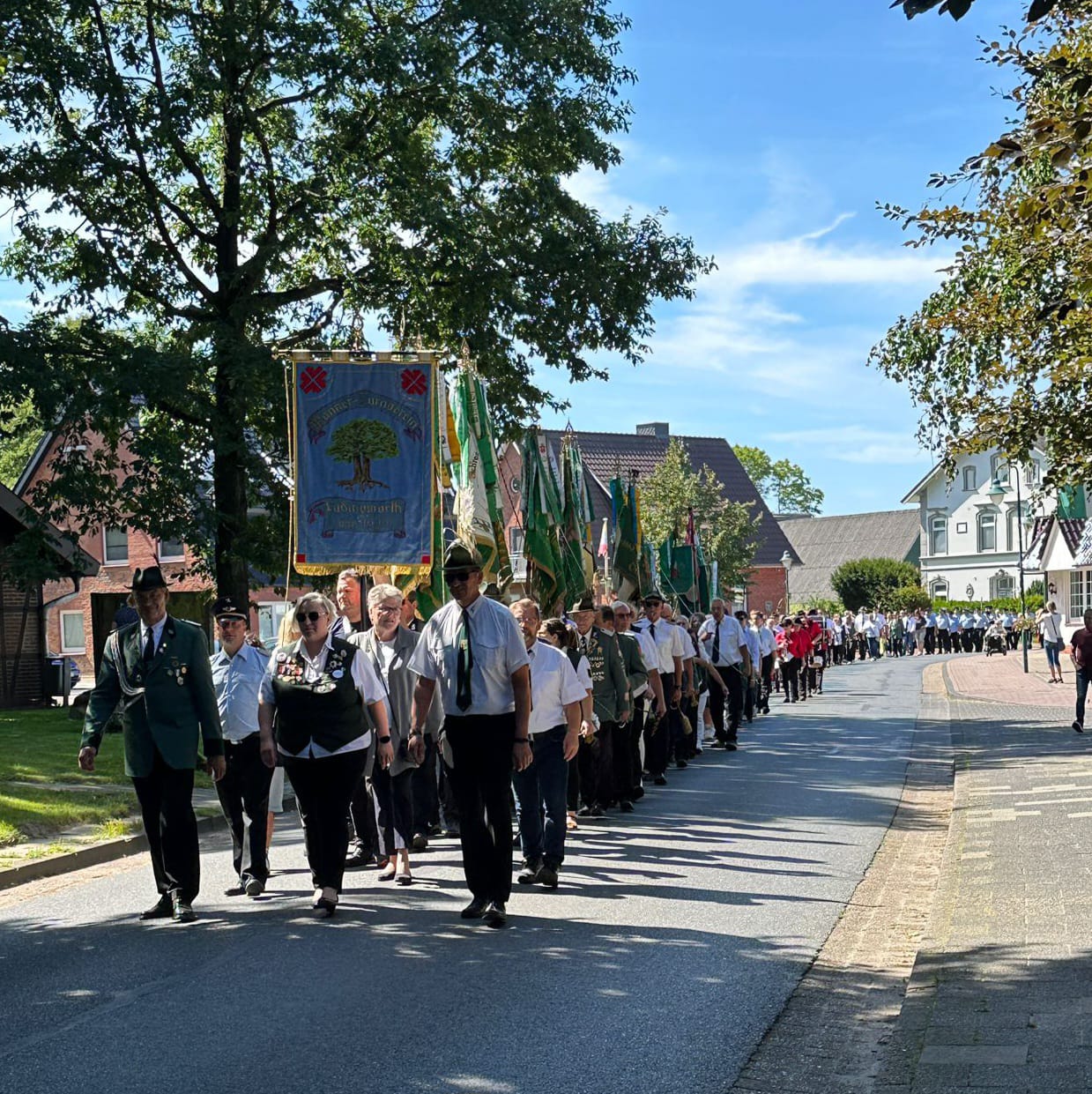 Der Festumzug stand in diesem Jahr unter dem Zeichen des 50-jährigen Jubiläums der Lüdingworther Jungschützen Abteilung. Diese marschierte gesondert, in Begleitung von 8 Jugendfahnen unserer befreundeten Vereine, zum Festumzug ein. Insgesamt nahmen 24 Fahnenabordnungen teil. Der Festumzug führte unter der musikalischen Begleitung durch das Musik- und Drum-Corps Wesergarde zum Haus des aktiven Königs Sascha Kunkel, um von dort die gesamte Königsfamilie abzuholen.